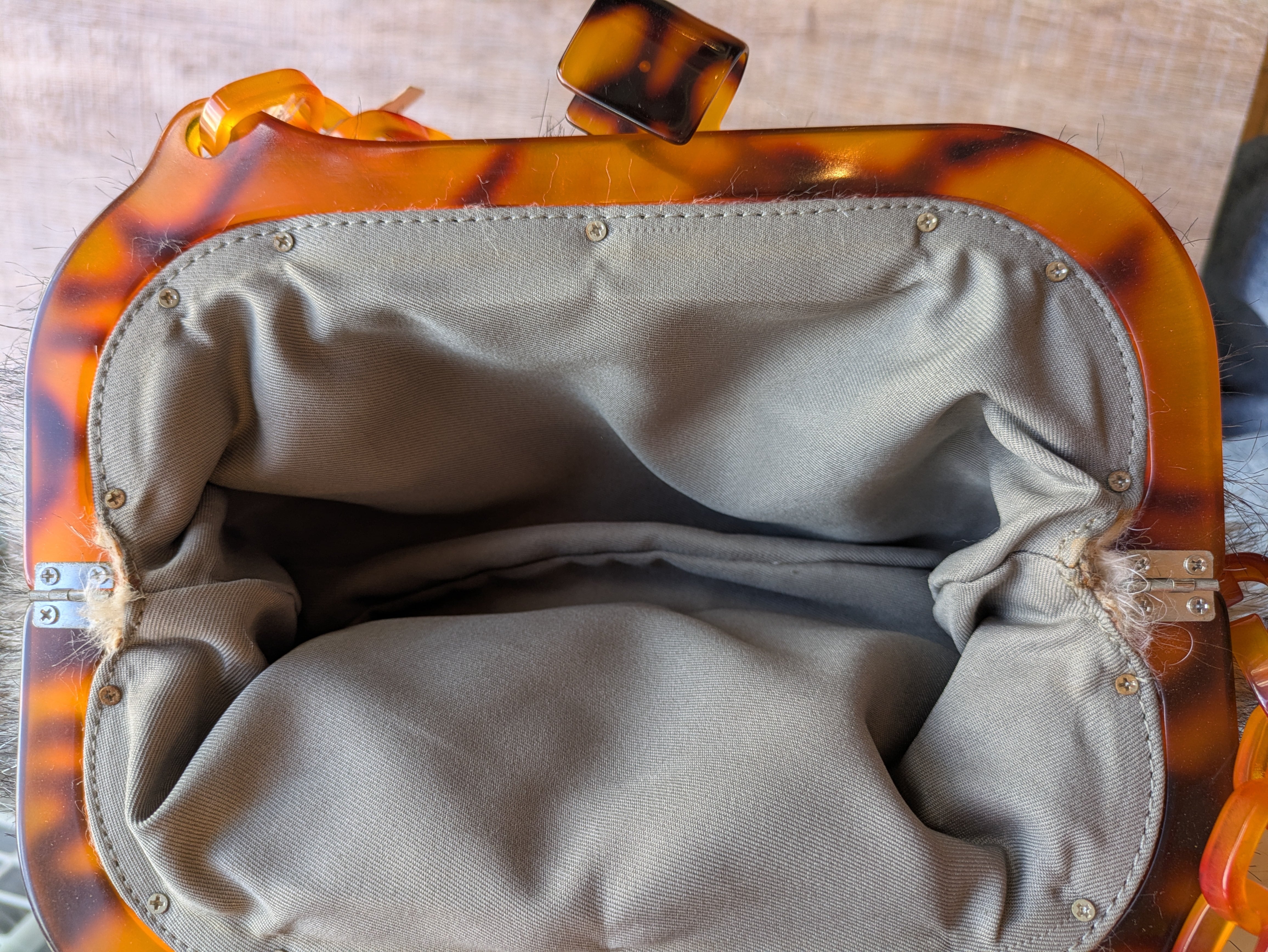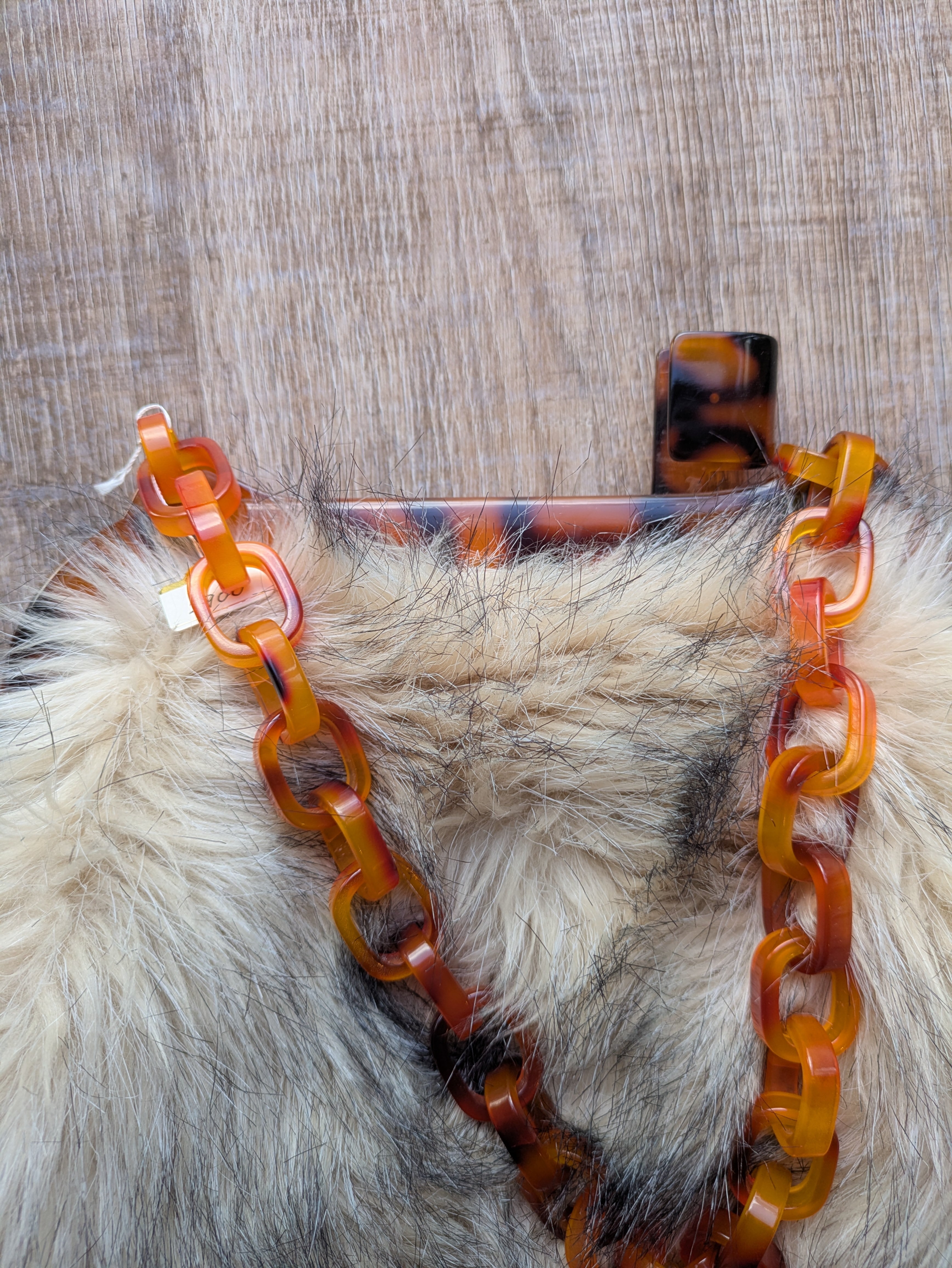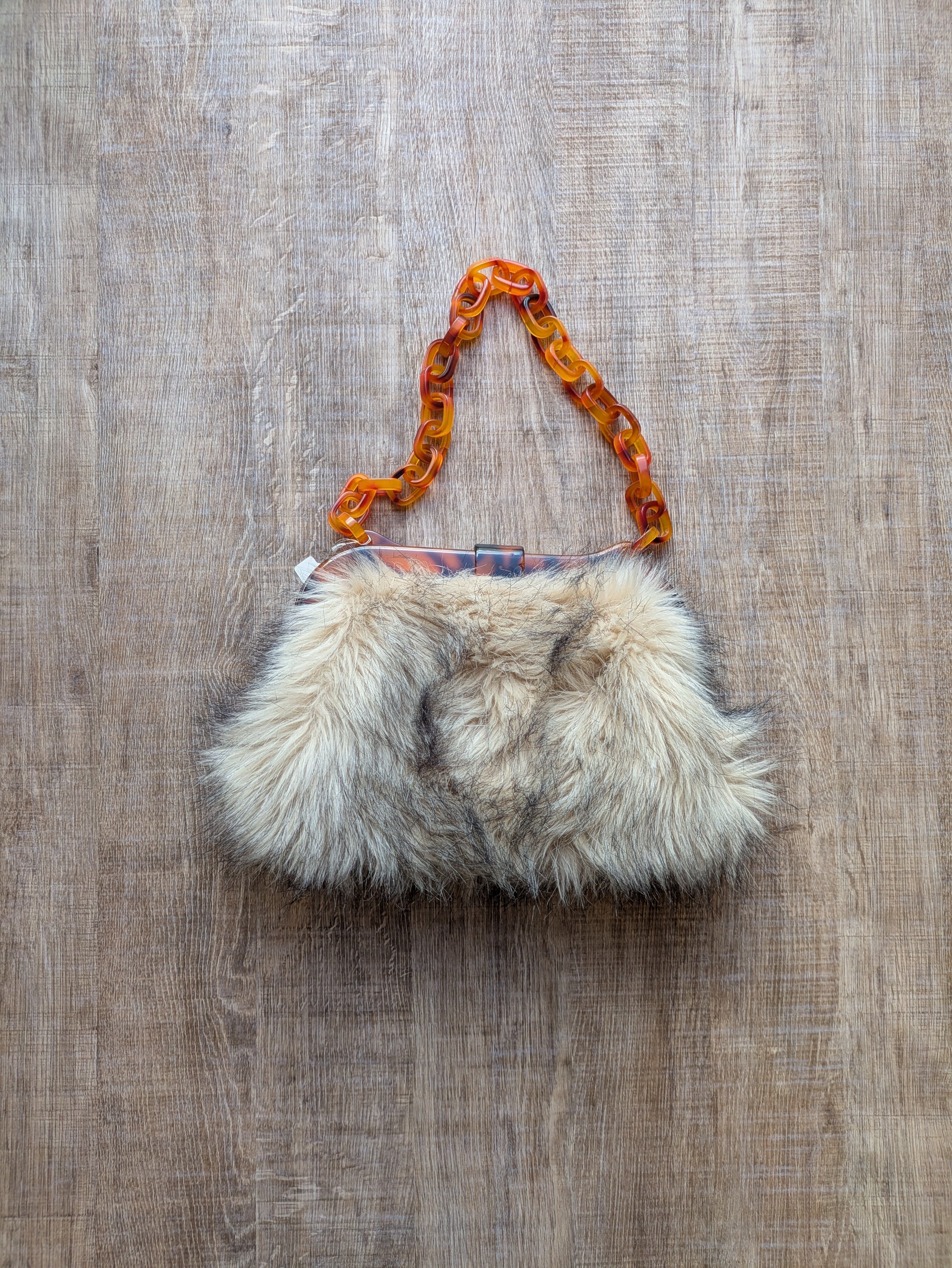 べっ甲風のプラスチックの持ち手がかわいいフェイクファーのバッグです。