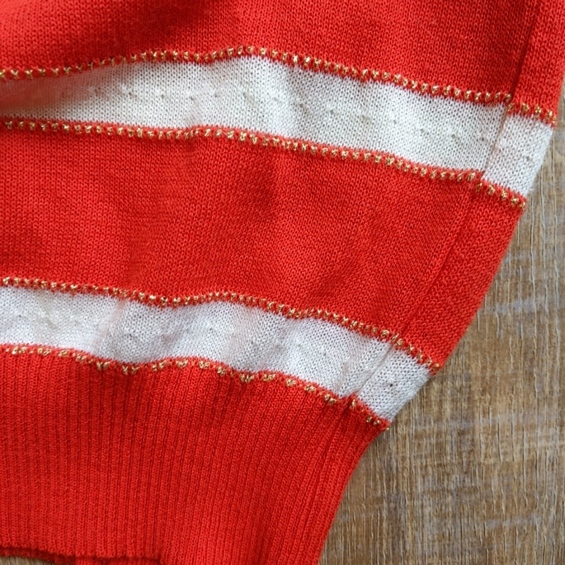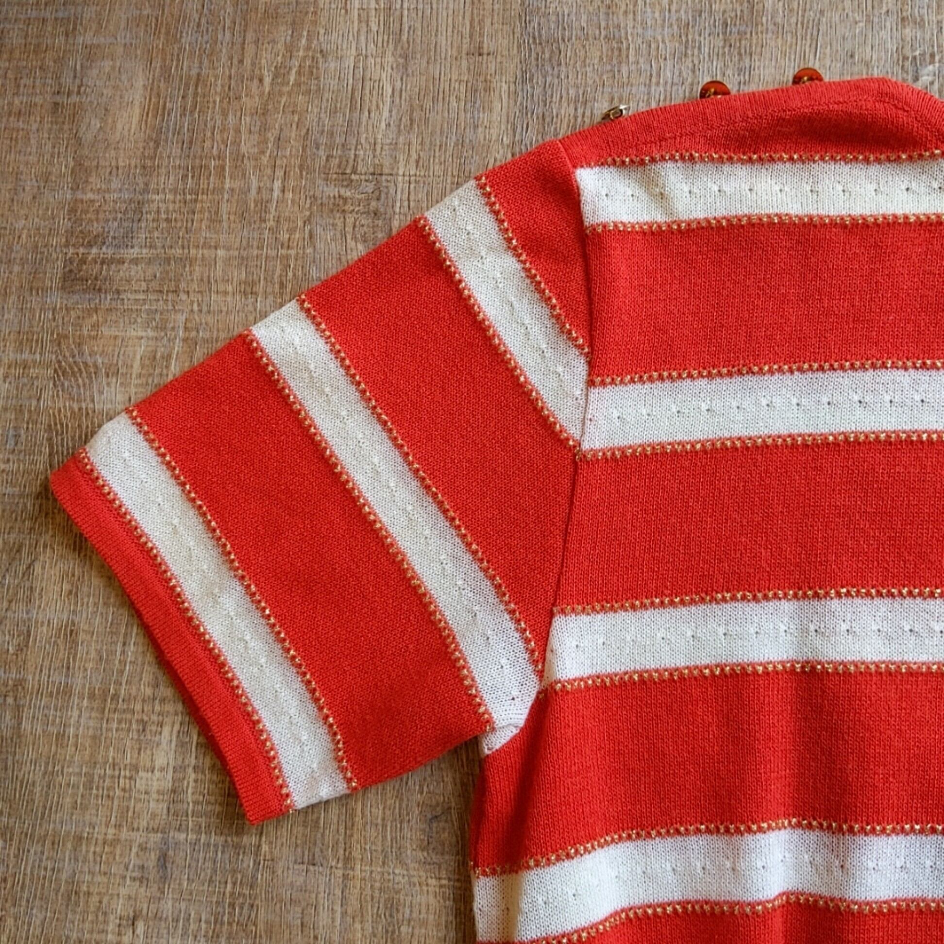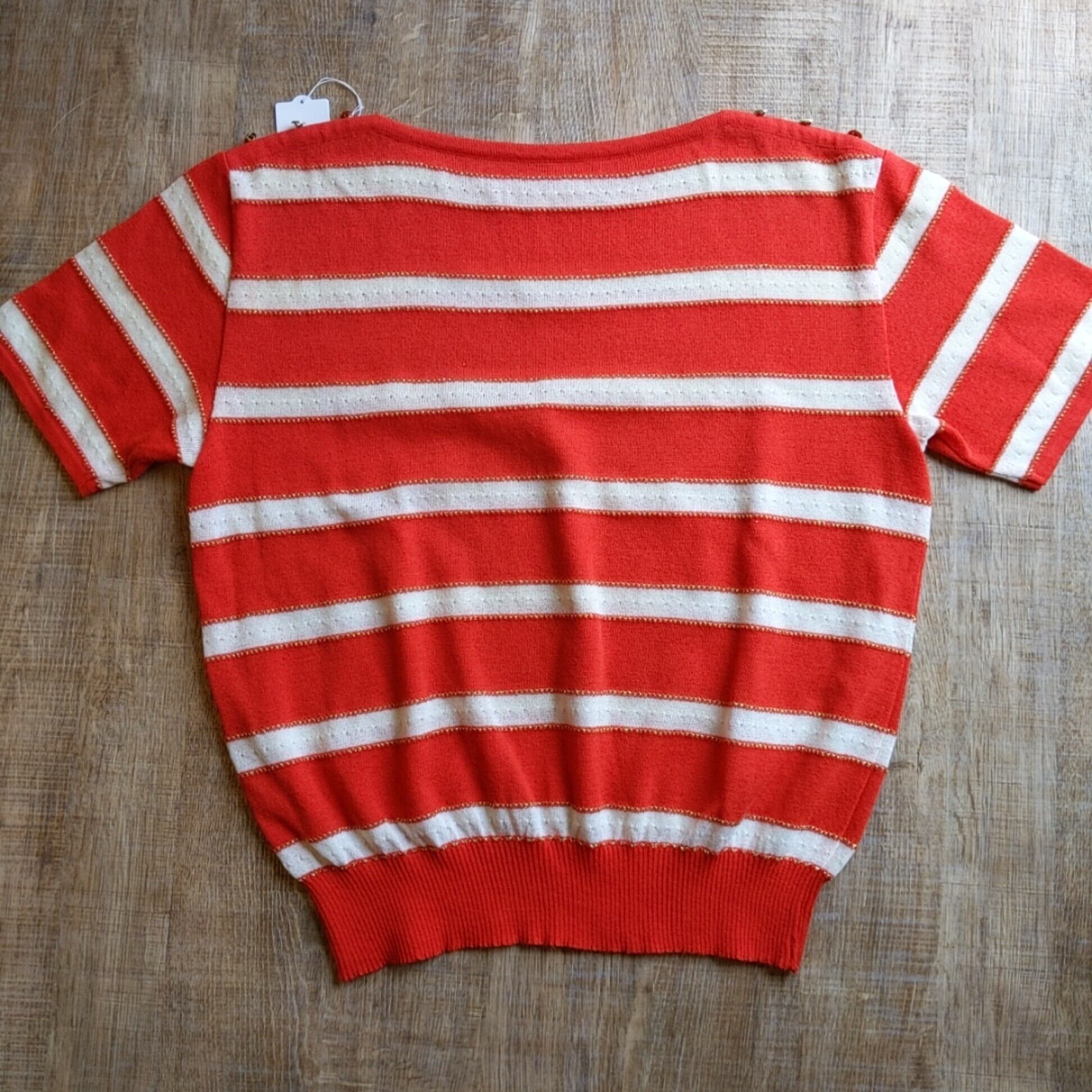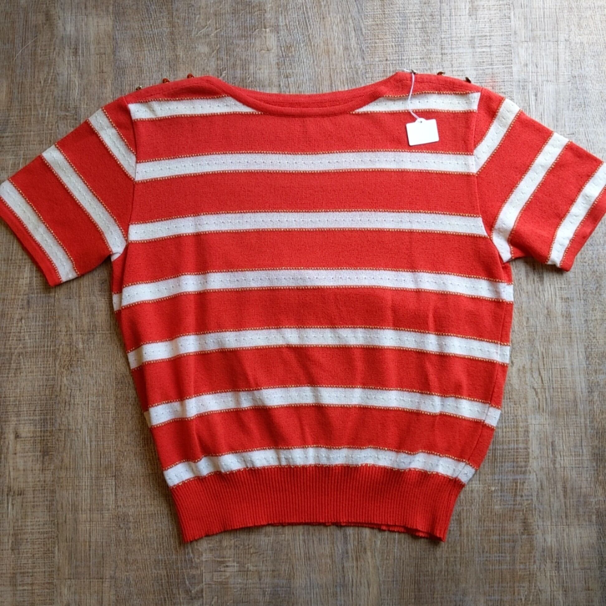 可愛いボーダーのニットです。ゴールドの糸がアクセントになってます。麻混じりの生地で涼しげです。幅広なデニムなどでどうでしょうか。