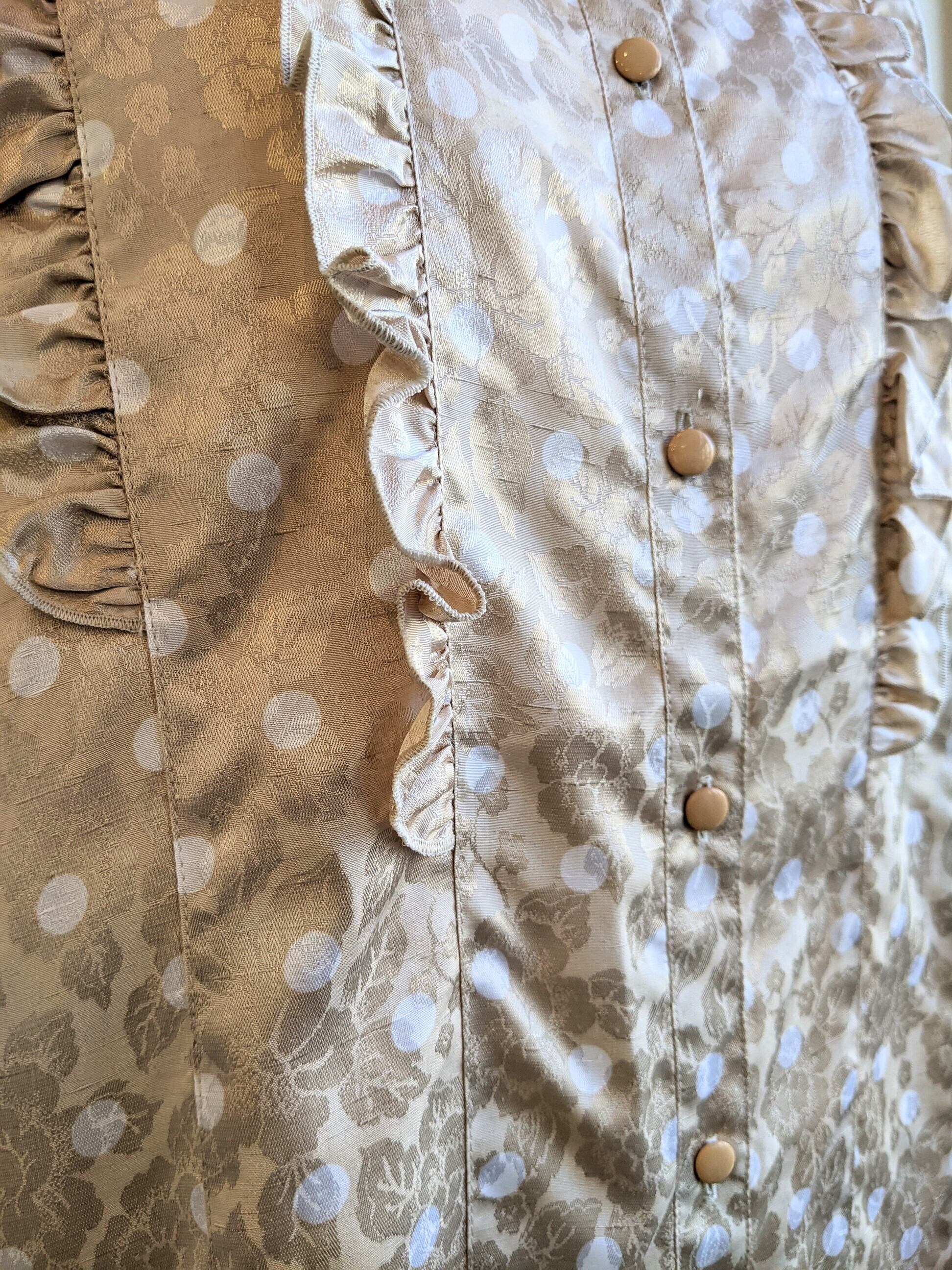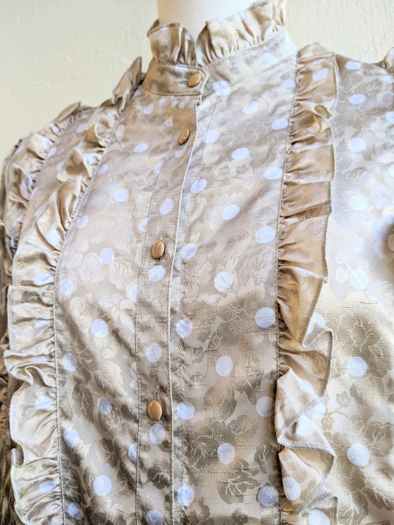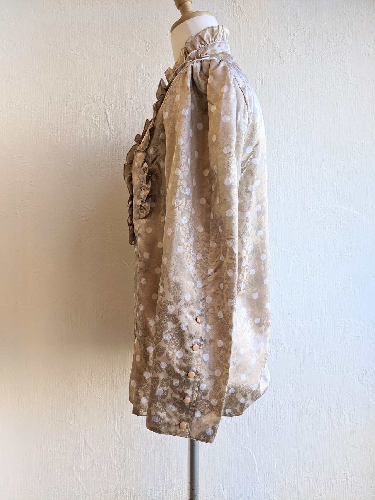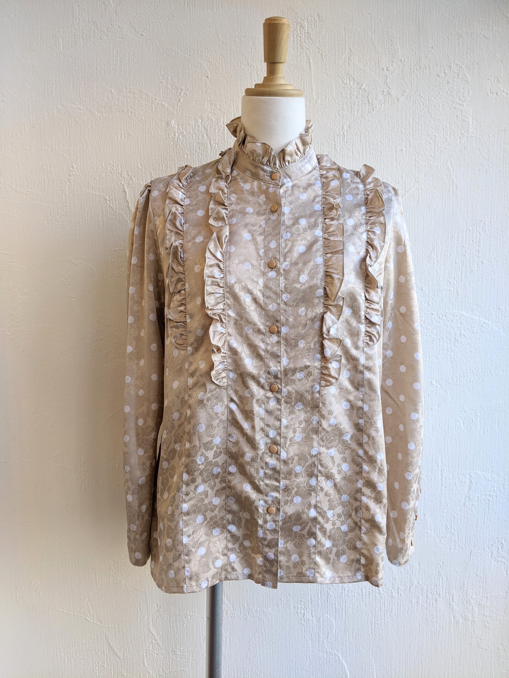 フリル使いがゴージャスなスタンドカラーのブラウスです。